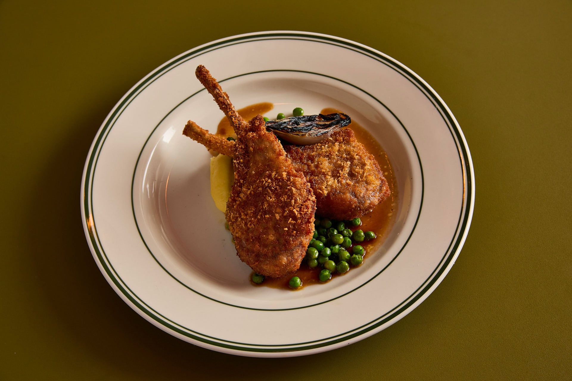 Crumbed Lamb Cutlets (2) — Mashed Potato, Peas, Grilled Shallot, Gravy 34